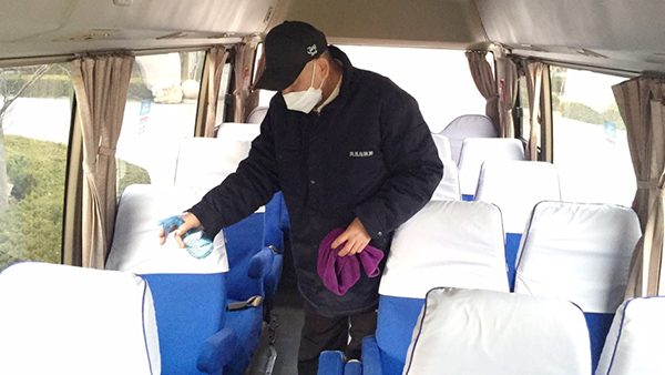 公司為在崗員工發放了口罩、噴壺、消毒酒精等防護用品,每日對各工作場所、班車、車庫、電梯、宿舍等進行定點消毒。